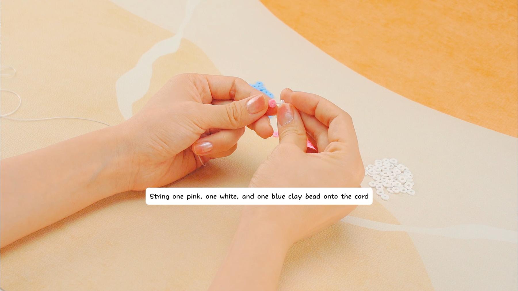 - Stringone pink, one white, and one blue clay bead orto the cord