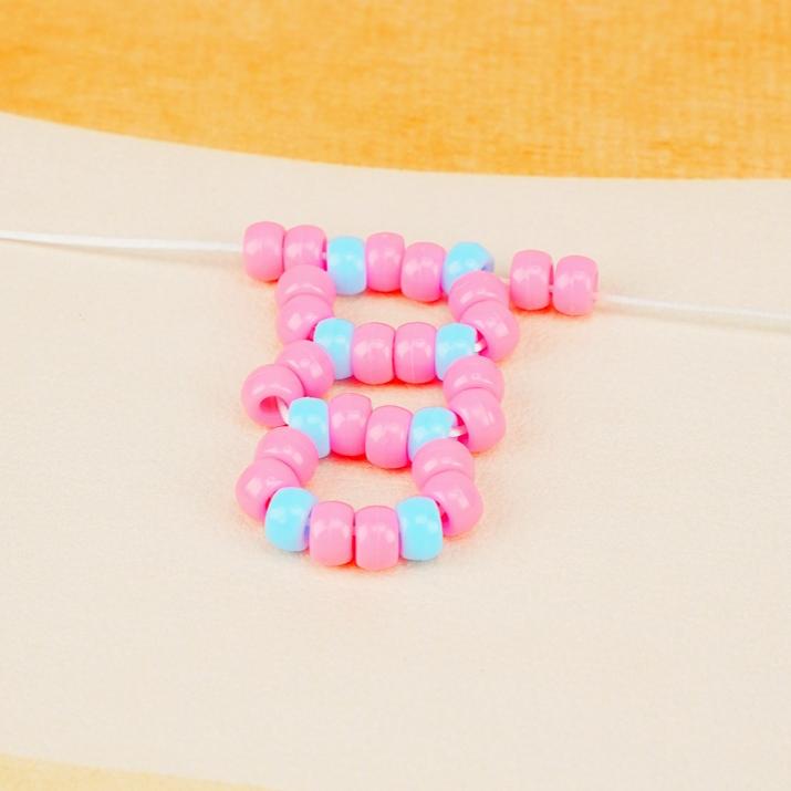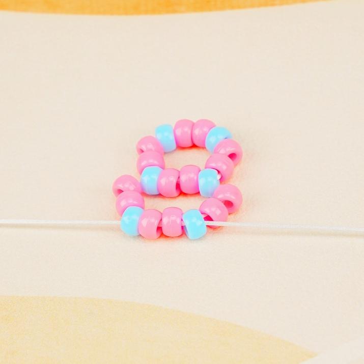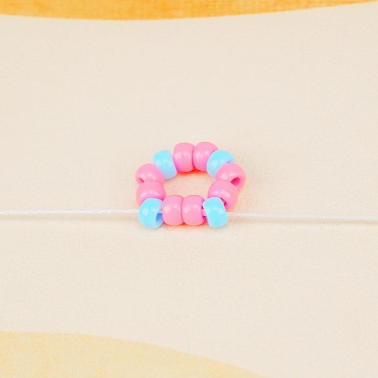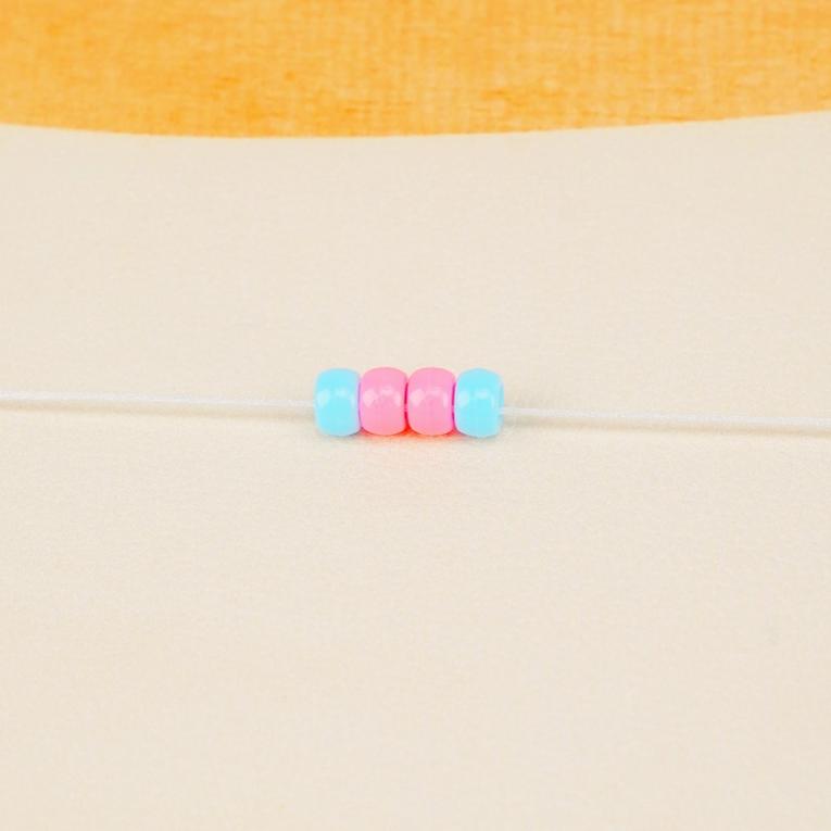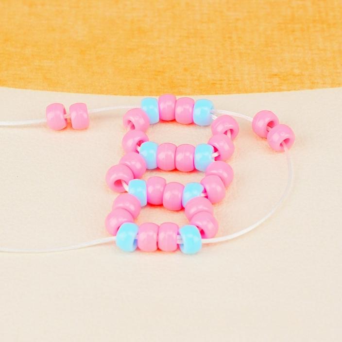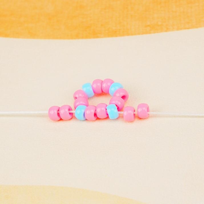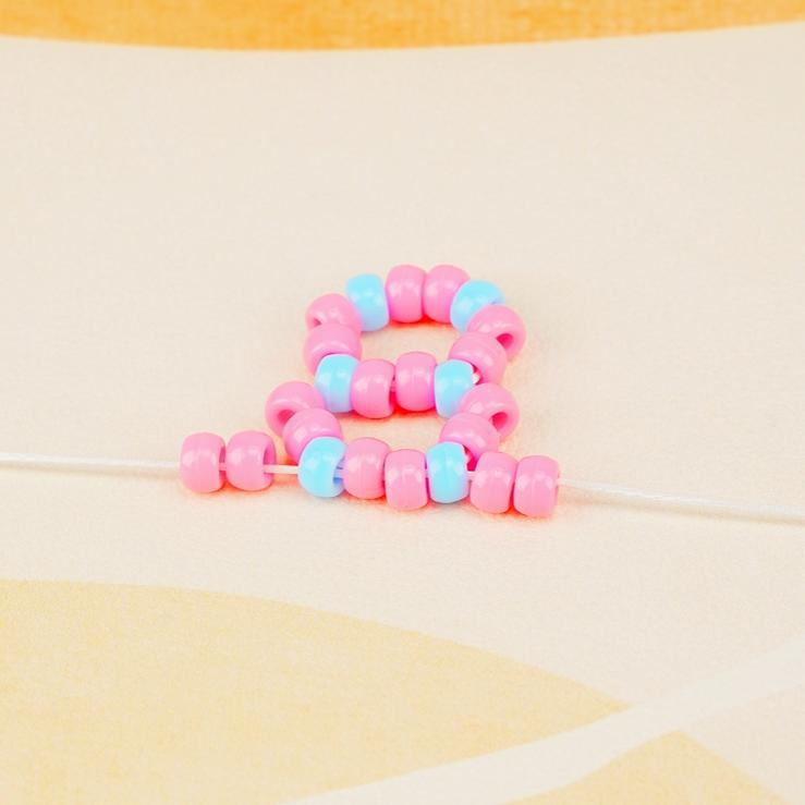 Cross the ends of the cord through a blue pony bead, followed by two pink pony beads and another blue pony bead.