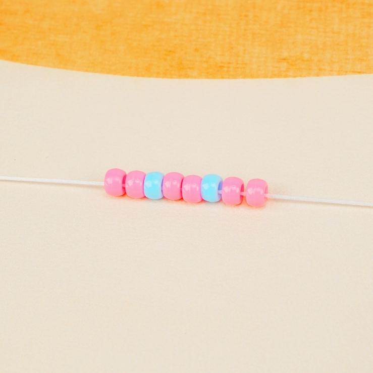 Thread a blue pony bead onto the cord, followed by two pink pony beads, and then another blue pony bead.