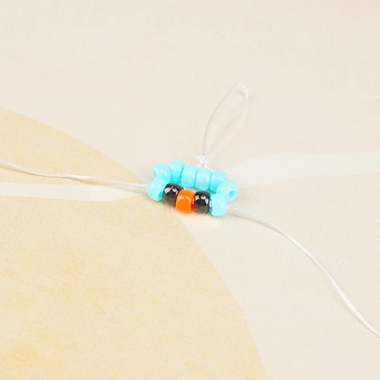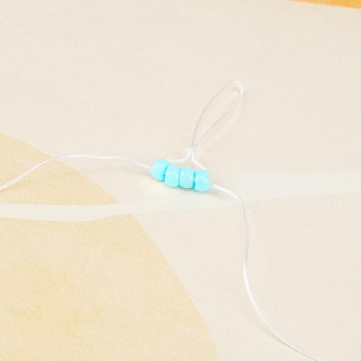 Thread both ends of the cord through four light blue pony beads, positioning them close to the loop.