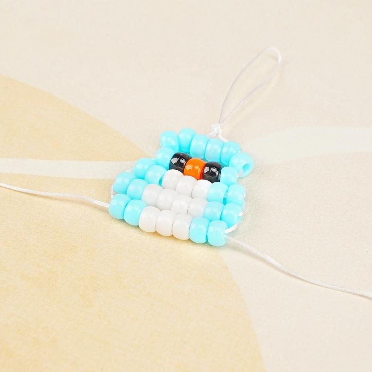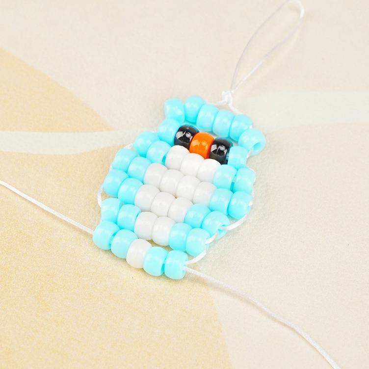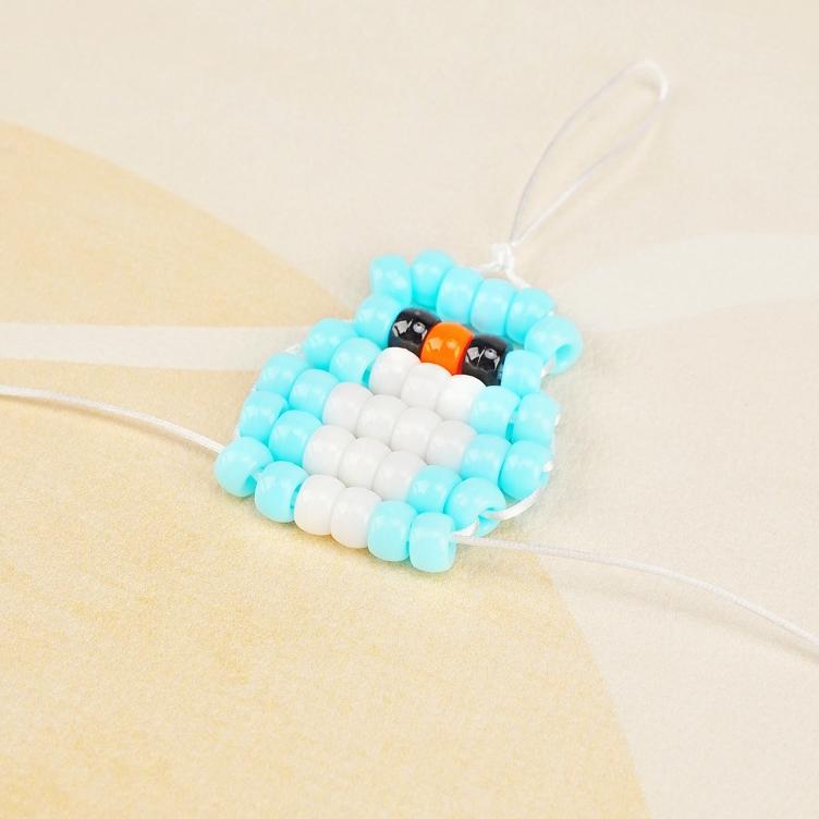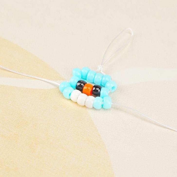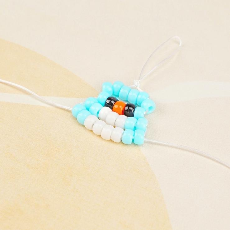 - Add one black bead for an eye, followed by a dark orange bead for the beak, and then another black bead for the second eye.