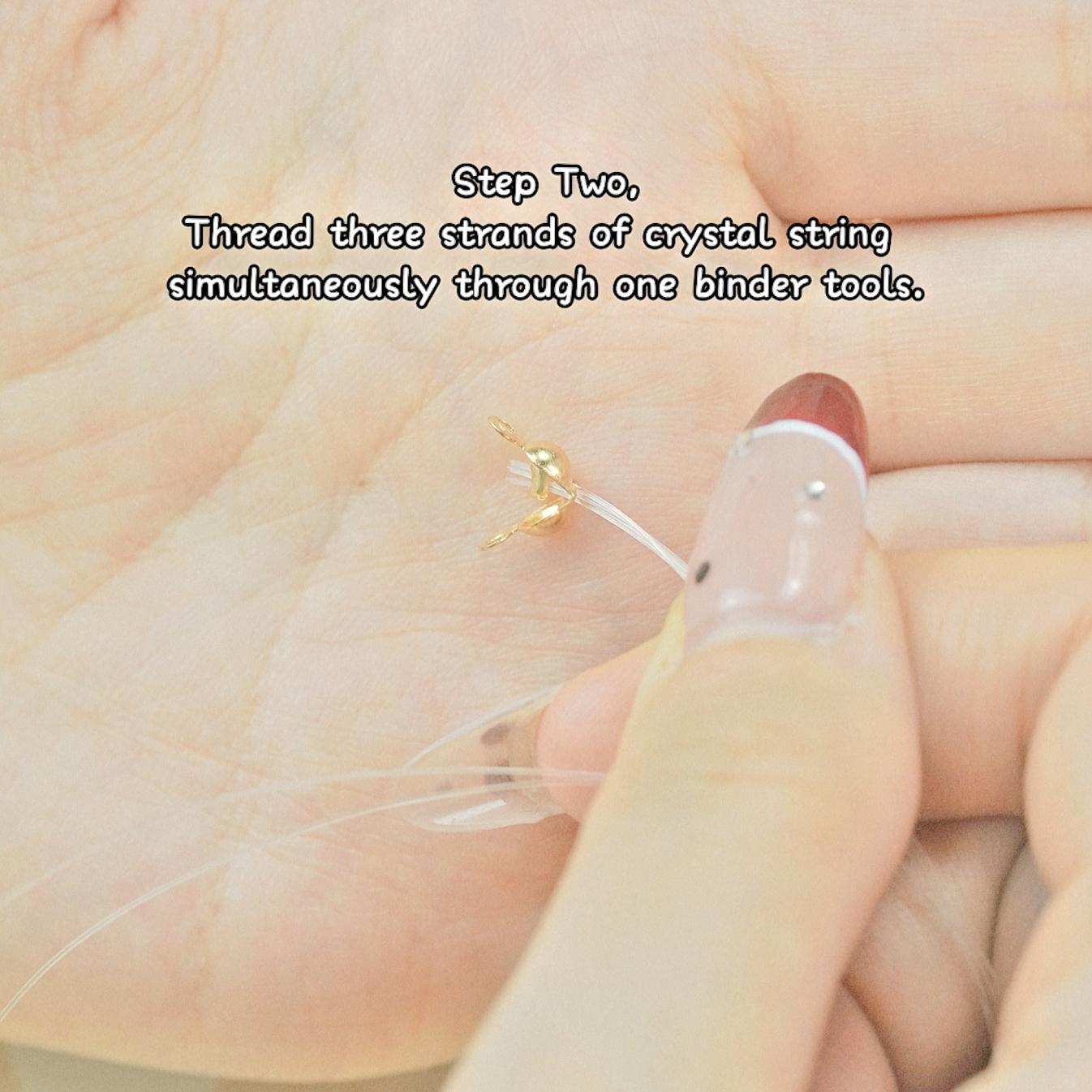 Slide a binding tool (like a binder or wire clamp) over all three strands, keeping them firmly held together. This helps prevent tangling as you start beading.
