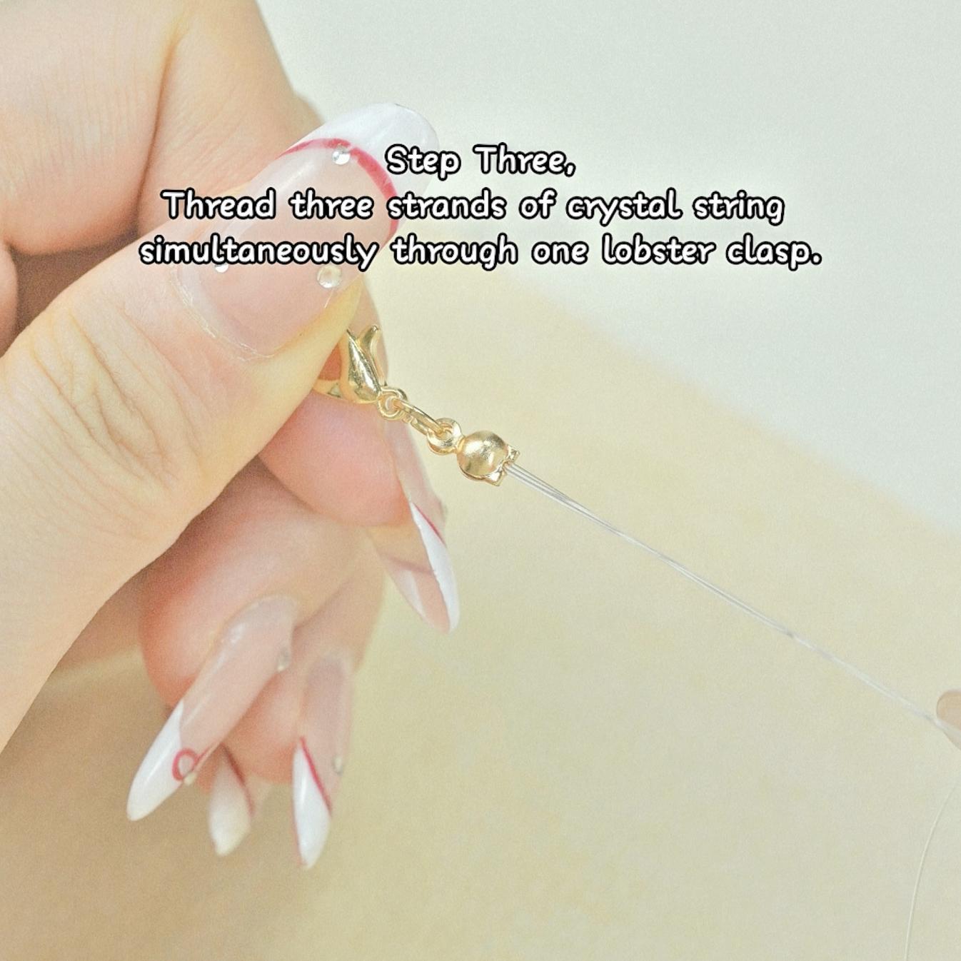 Thread all three cords through the lobster clasp, and secure with another crimp bead to keep it in place. The clasp will allow the bracelet to open and close easily.