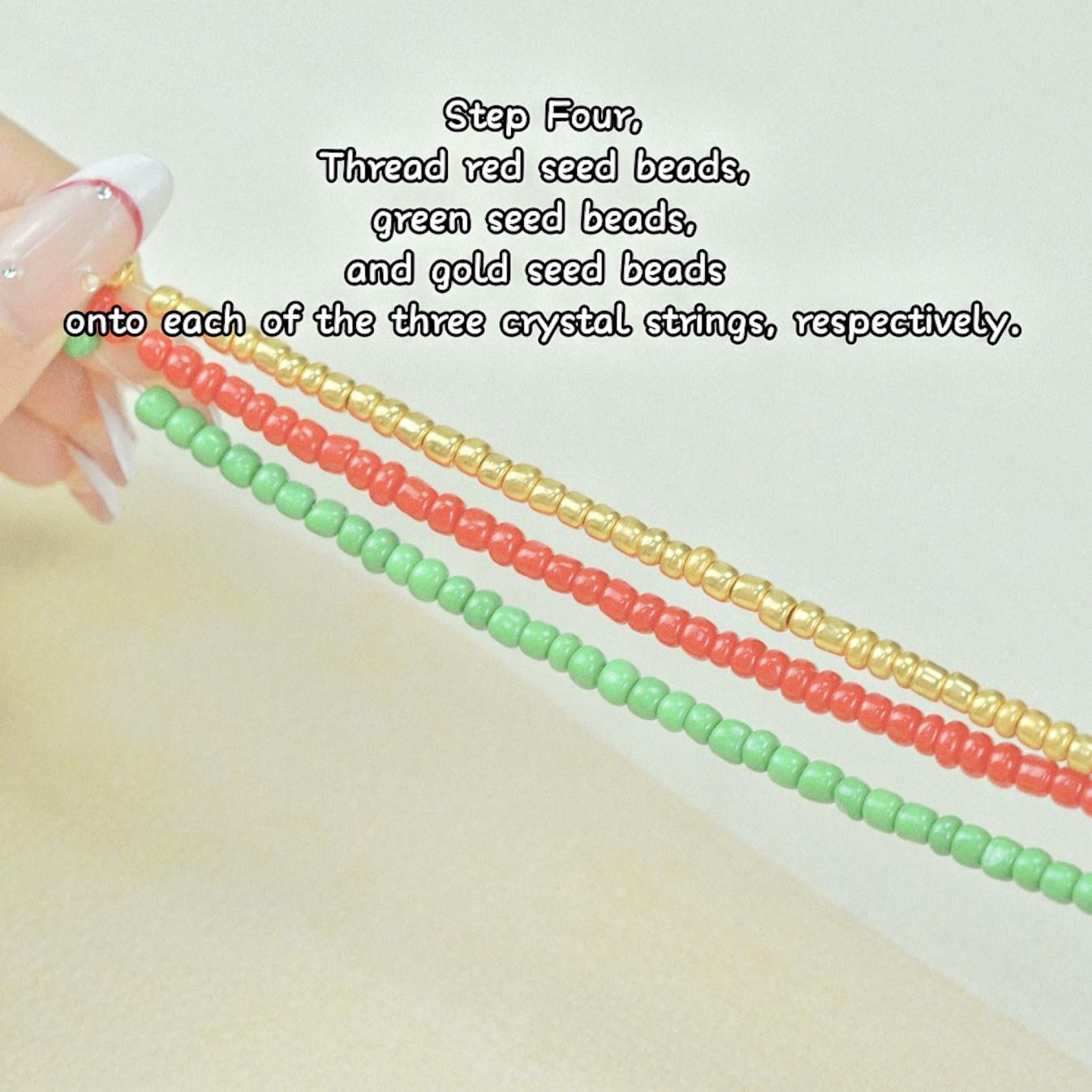 Now, the fun part begins! String red, green, and gold seed beads onto each strand separately: